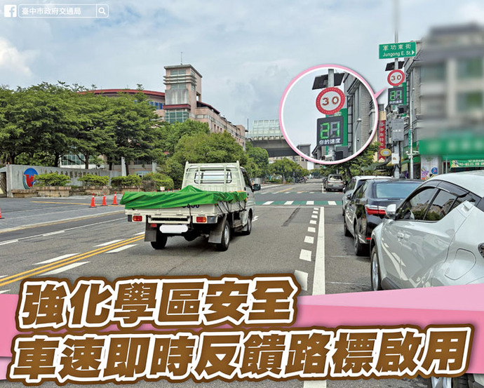 交通局表示,通學區內道路視車速調整速限,原則規劃速限30、40公里交通寧靜區,北屯區軍功國小所在路段交通繁忙,透過智慧科技導入,讓駕駛即時意識到行車速度,更能在危險發生前主動預警,啟用首座智慧路標車速警示系統,經評估觀察後,今年預計將配合學校周邊通學環境改善及地方需求的3所學校建置。