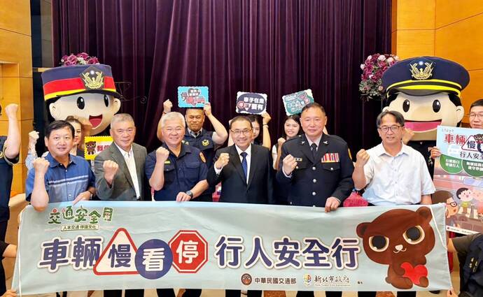 圖說:新北市長侯友宜、警察局長方仰寧、義警大隊長陳汪全及民力代表參與本次金勤獎義警楷模表揚活動,並與警察局交通安全宣導團合影。
