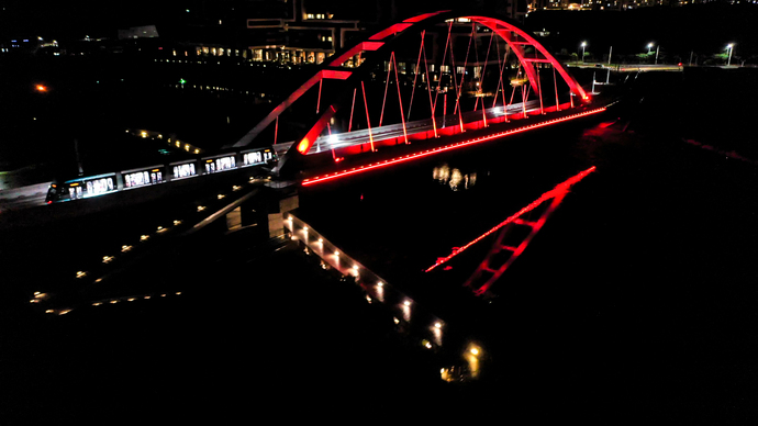 新北捷運局指出,已通車的新北環狀線板橋-板新站間跨縣民大道段隔音牆也有春節燈光秀喜迎馬年,另外,安坑輕軌安心橋和淡海輕軌藍海橋都有燈光美化,新北各路線捷運橋梁將變身最美城市天際線!光雕美化後的橋梁成為夜間河岸最吸睛的風景線,隨著燈光律動點亮河岸空間,串聯周邊步道與捷運動線,營造輕鬆愜意、適合漫步與拍照的夜間氛圍,捷運橋梁從交通設施升級為新北夜生活與城市記憶中的亮眼地標。