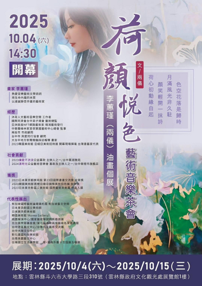 「荷顏悅色」油畫個展不僅是一場藝術的視覺盛宴,更是一次心靈的沉澱之旅。 誠摯邀請所有喜愛藝術的民眾,在10月4日至10月15日期間,蒞臨雲林縣文化觀光處展覽館,一同感受李蕙瑾女士透過畫作所傳達的生命禪意。