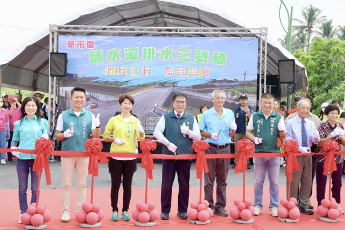 【記者吳淑華/台南報導】新市區鹽水溪排水三號橋於(7)日舉行通車典禮,台南市長黃偉哲上午主持剪綵,在立委陳亭妃,台南市議會副議長林志展,議員陳碧玉、李偉智、余柷青,立委服林俊憲、林宜瑾辦公室及各議員服務處代表、里長及鄉親共同見證下,象徵改建工程正式完工啟用,改善地方交通動線。