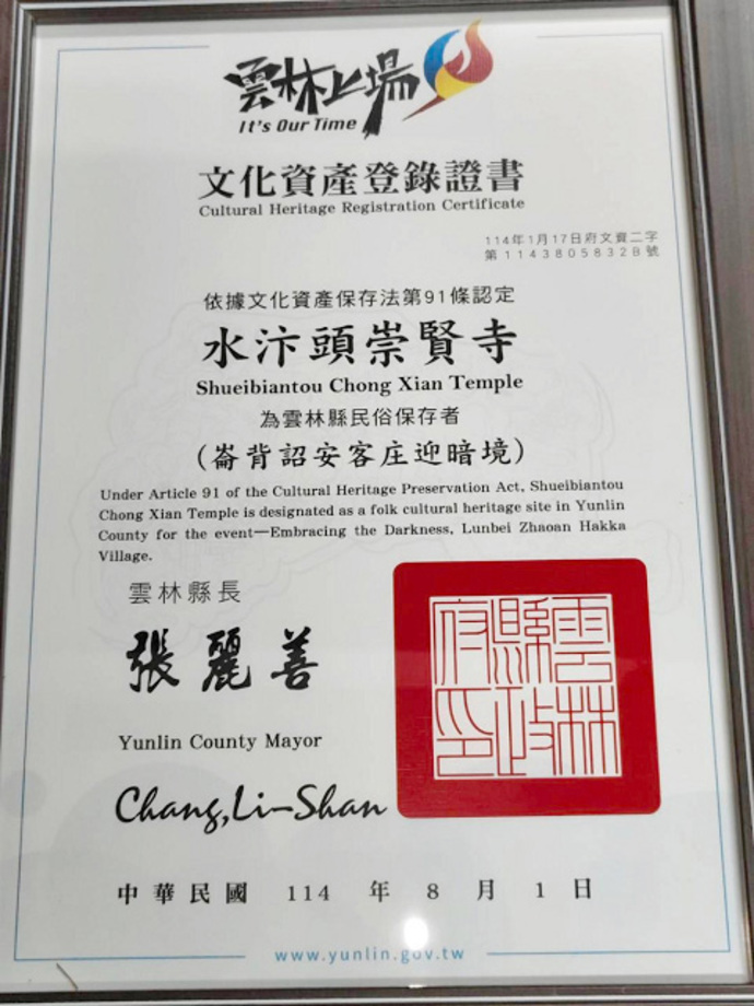 【記者譚國民/報導】傳承近百年的獨特客家民俗——崙背詔安客庄迎暗境,在中秋夜晚的水汴頭崇賢寺盛大展開。 雲林縣長張麗善特地來到活動現場,將民俗登錄證書親手頒發給保存者水汴頭崇賢寺,藉此肯定並鼓勵當地居民多年來為這項珍貴傳統所付出的努力與傳承。