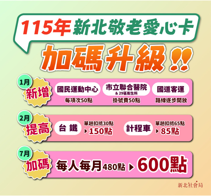 侯友宜說,為讓長輩活躍老化,擴大社會參與,115年起將陸續新增、提高和加碼敬老愛心卡的使用。 包含1月起除原有公車、捷運外,可搭乘國道客運(起訖均在北北基桃宜)、可使用國民運動中心(每項次50點),以及市立聯合醫院與29區衛生所掛號費50點;2月起提高台鐵單趟30點至150點(起訖站開放北北基桃宜)、計程車單趟從65點提高至85點。 7月起,則將敬老愛心卡從原來480點加碼至600點,預計超過89萬的長輩及身心障礙者能受惠。