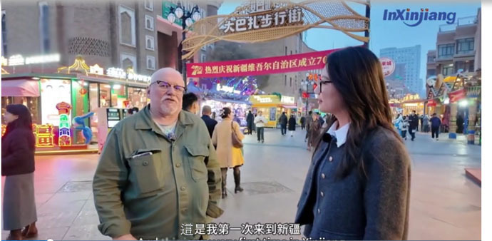 ↑圖說:英國漢學家、翻譯家蒲華傑逛新疆(InXinjiang視頻截圖)