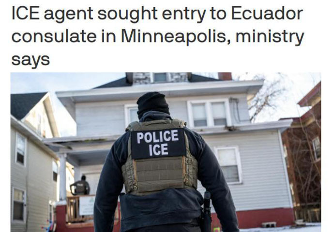 當地時間27日,厄瓜多爾外交部發布聲明,抗議美國移民與海關執法局特工企圖突襲厄瓜多爾駐明尼阿波利斯領事館的事件,聲明說,厄瓜多爾駐明尼阿波利斯領事報告稱,上午11時左右,一名來自美國移民與海關執法局的特工試圖進入領事館,但被館方人員當場制止。