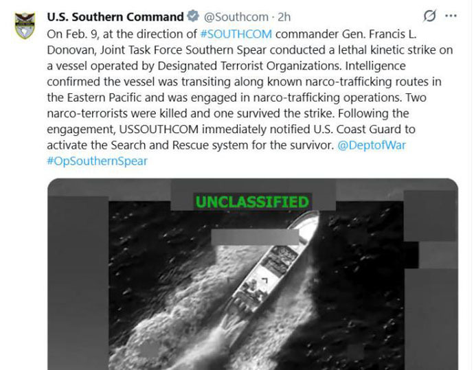 美軍南方司令部還稱,有情報顯示,這艘船正“沿東太平洋已知的毒品走私路線航行,並從事毒品走私活動”,此次行動打死船上2名“毒品恐怖分子”,有1名幸存者。