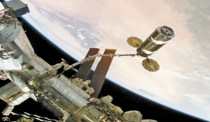 ↑圖說:“天鵝座”被國際空間站機械臂捕獲的瞬間(供圖)