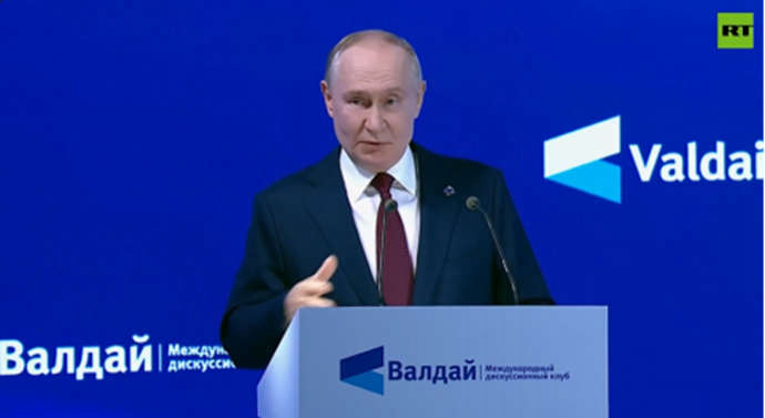 俄羅斯總統普京出席在俄羅斯南部城市索契舉行的瓦爾代國際辯論俱樂部第22屆年會全會活動,其間,普京表示,關於俄羅斯計劃攻擊北約的想法是“無稽之談”,如果一些歐洲國家領導人真的相信這一點,那他們是無能的;如果他們不相信,卻仍試圖說服其民眾相信,那則是不誠實的行為。