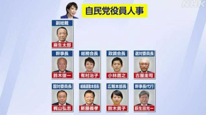根據任命,麻生太郎擔任自民黨副總裁;此外,自民黨“四大要職”中,鈴木俊一出任幹事長、有村治子出任總務會長、小林鷹之出任政調會長,古屋圭司則擔任選舉對策委員長。